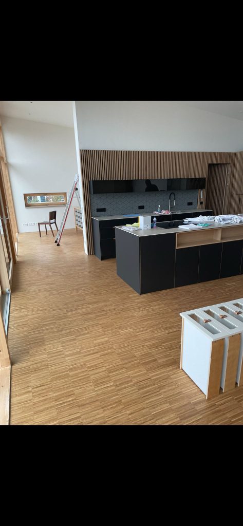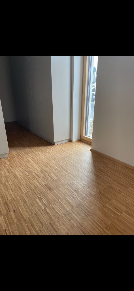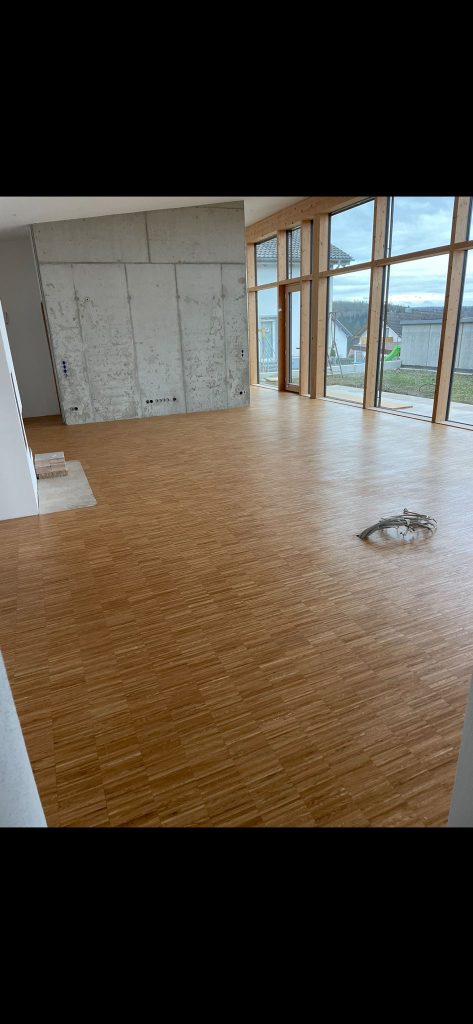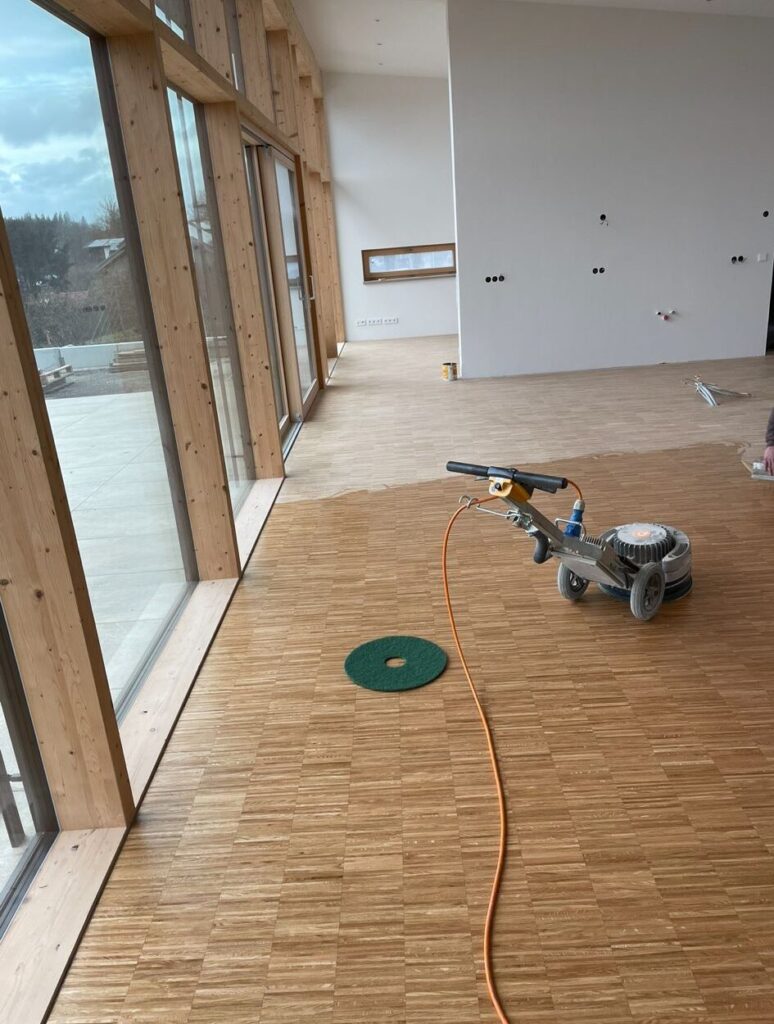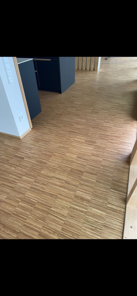 Die Oberfläche von Industrieparkett ist werksseitig unbehandelt. Die Finalisierung der Oberfläche erfolgt in zwei Schritten auf der Baustelle. Zuerst wird das Parkett abgeschliffen, danach entweder versiegelt, d.h. lackiert, oder geölt.