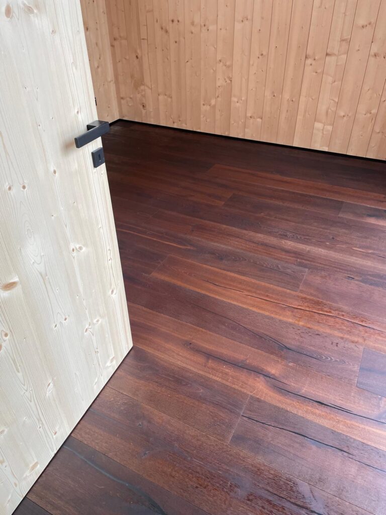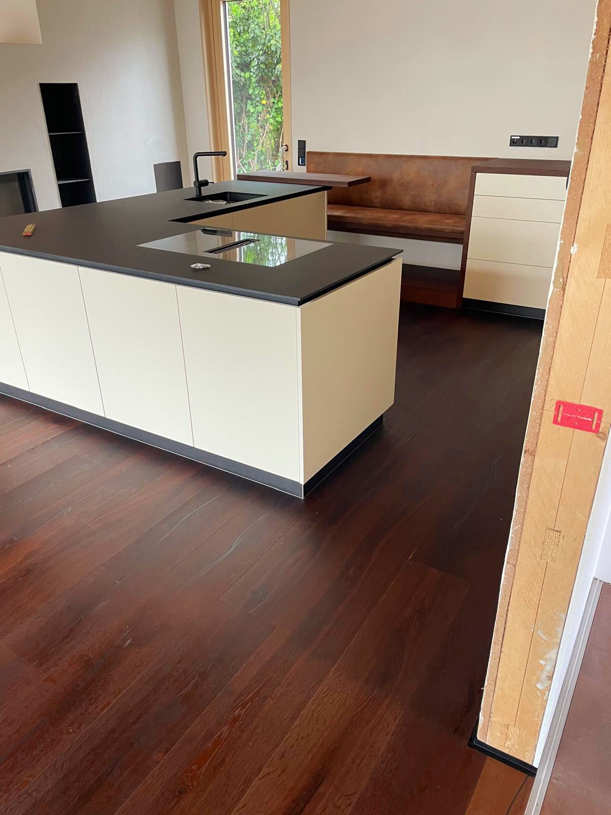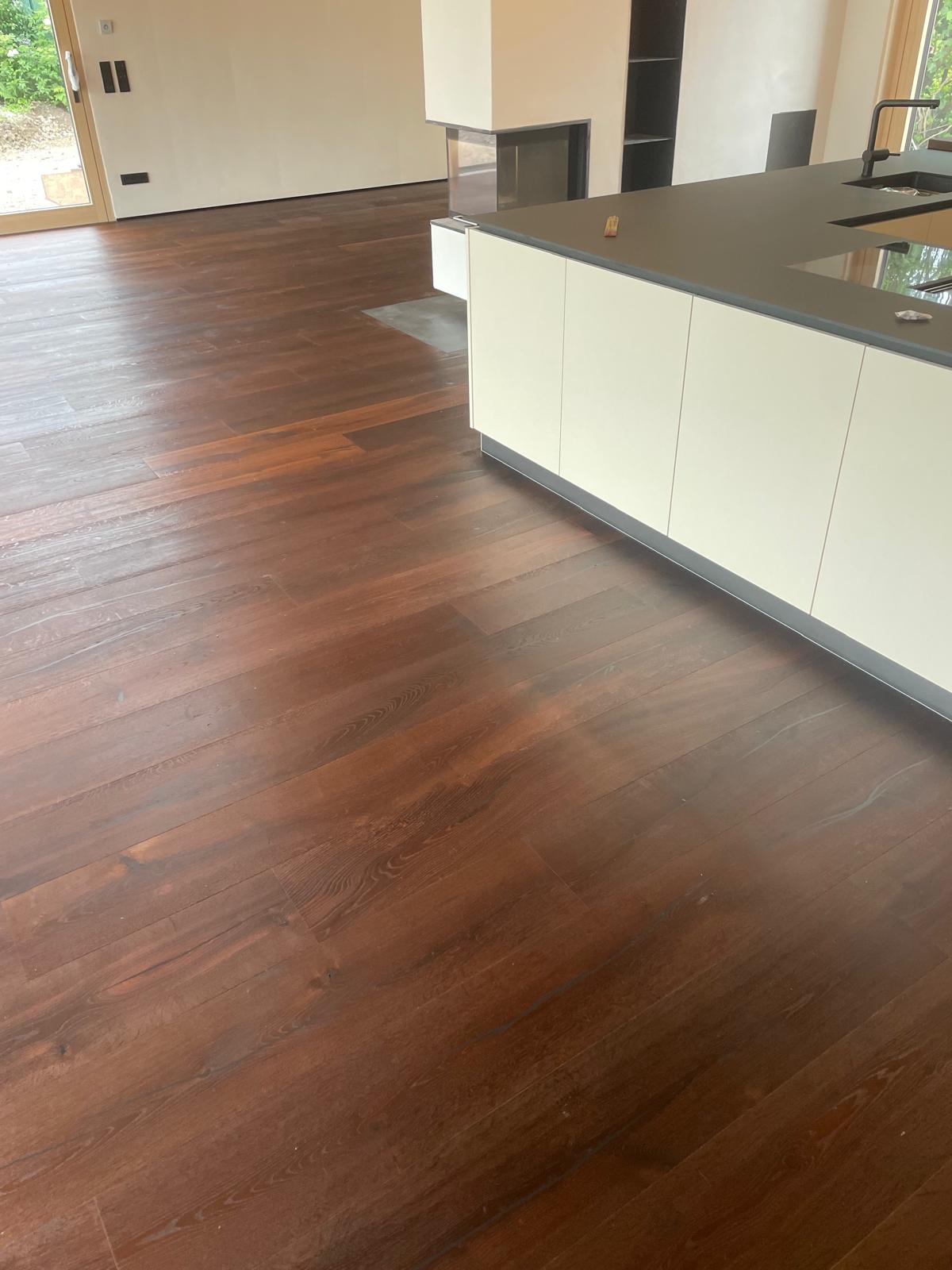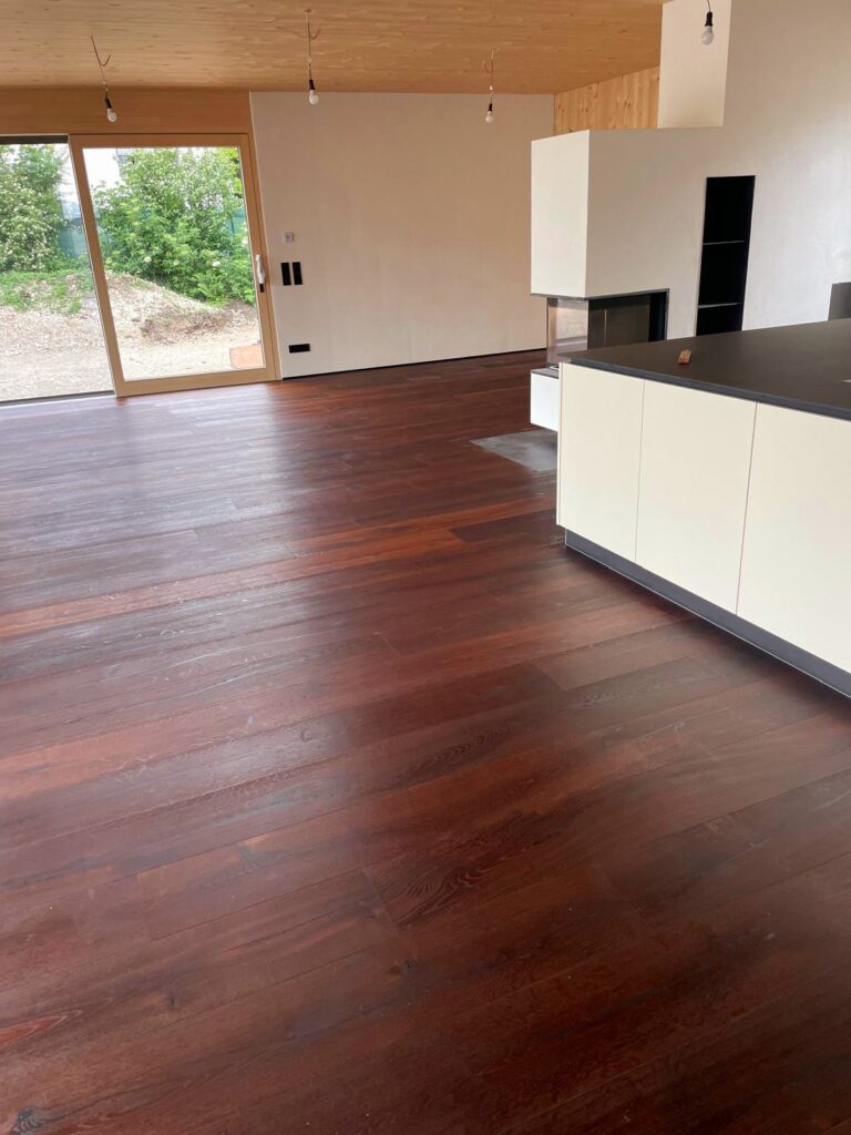 In München durften wir eine dunkle Landhausdiele liefern und verlegen, welche durch ihren rötlichen Farbton – warm, edel und zeitlos wirkt. Die dunkle, elegante Farbnuance sorgt für eine edle Raumwirkung und bildet einen stilvollen Kontrast zu hellen Wänden und modernen Einrichtungselementen.