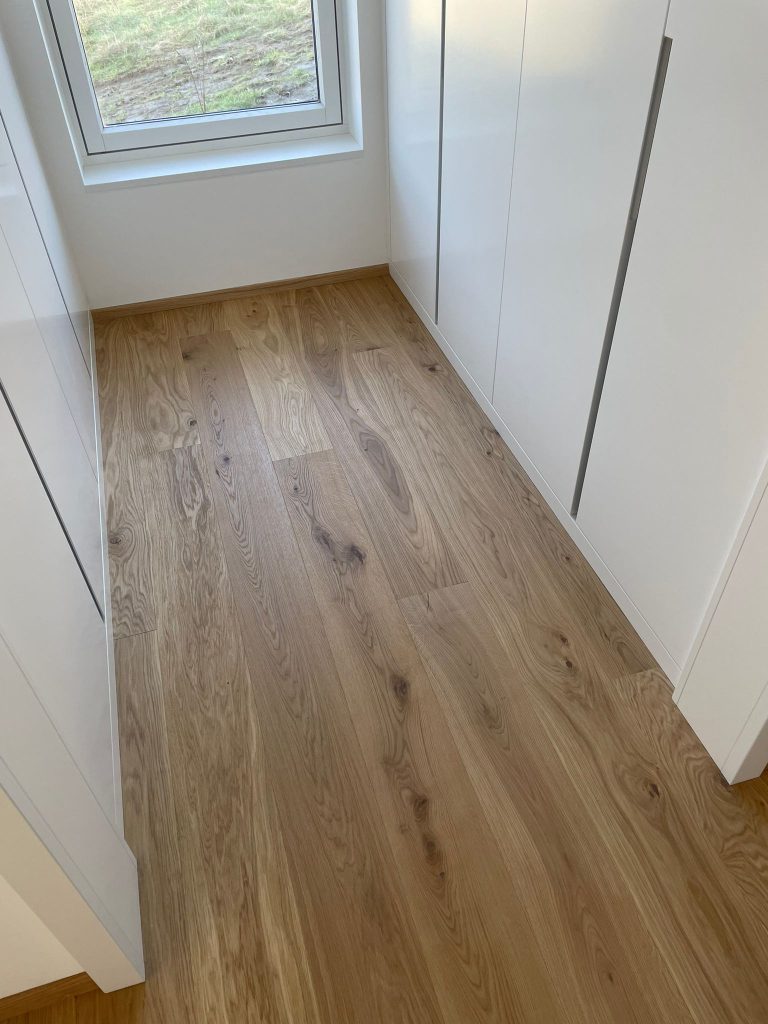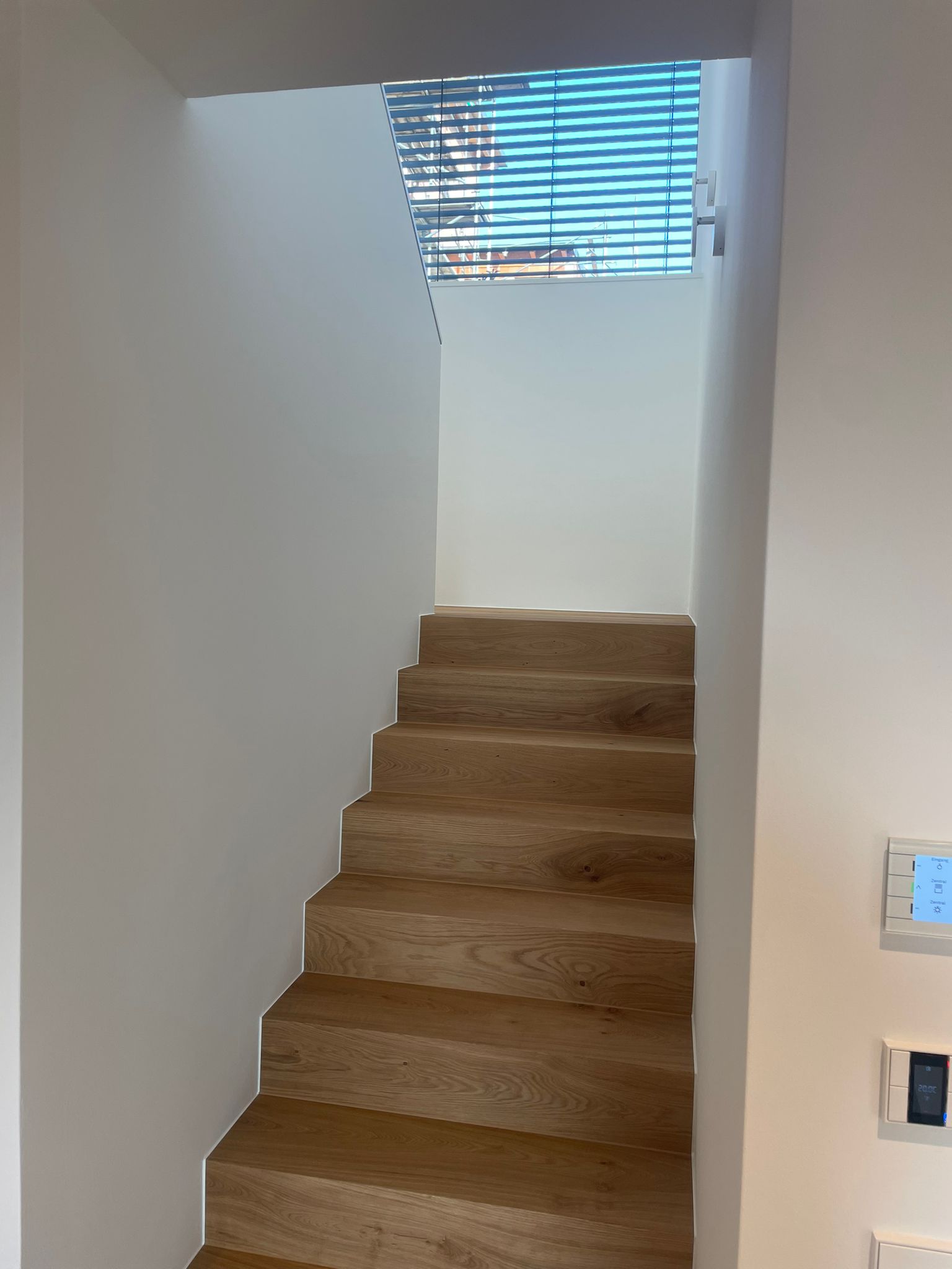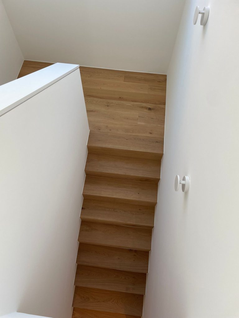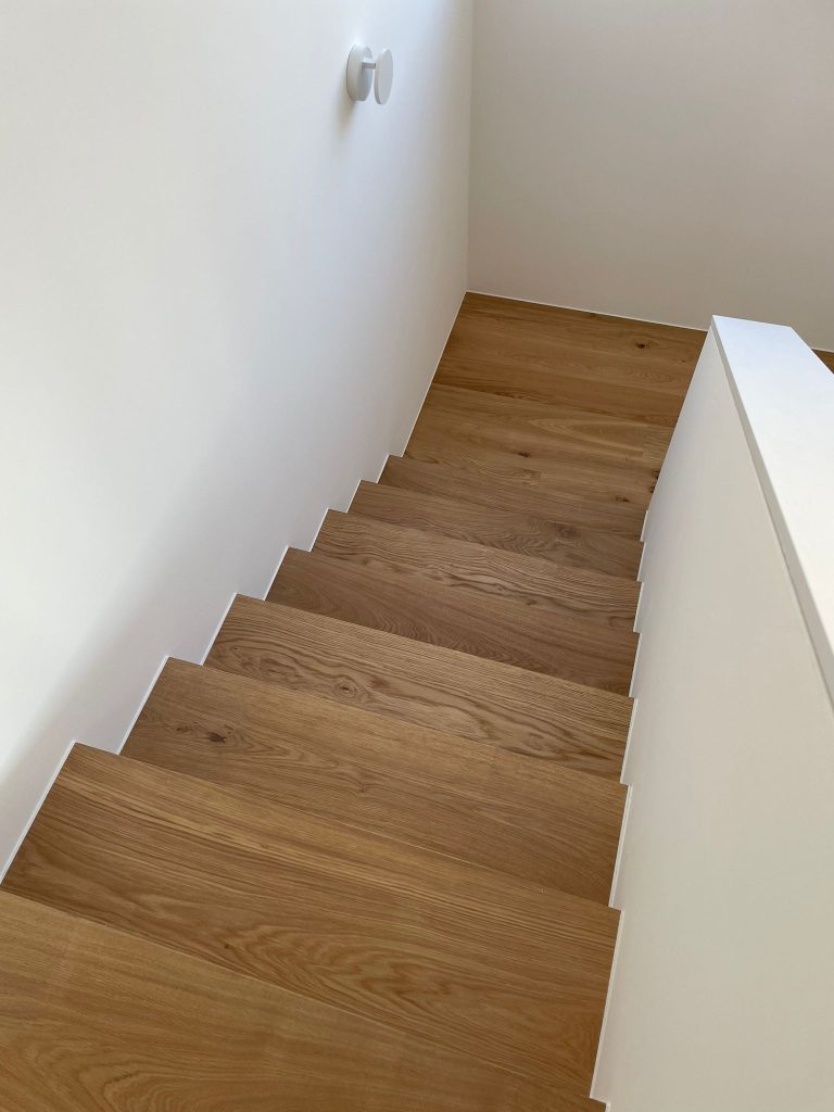 Treppen sind längst nicht mehr nur der direkte Weg ins Obergeschoss, sondern ein detailreiches Gestaltungselement mit grossem Einfluss auf die Raumwirkung. Entscheidend ist dabei nicht nur die Architektur der Treppe und ihre Konstruktion, sondern auch die Belegung. Vorteil: Parkettboden und Treppe haben die gleiche Farbe und Oberflächenbehandlung sowie den gleichen Glanzgrad.